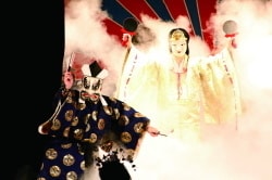 この物音に気づいた綱は、酒呑童子と茨木童子に挑みかかりますが、妖術にかかり倒れ込みます。そこに石清水八幡のお告げにより駆けつけた頼光の助けを得て酒呑童子と激しく闘いますが、酒呑童子は虚空飛天の妖術をもって大江山に飛び去っていくという物語です。