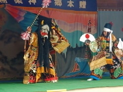 八千代町の土師地区では、明治時代より土師神楽と呼ばれる独特の神楽が盛んに舞われていました。日高山神社において、「岩戸」、「天神」、「大江山」等が奉納されていましたが、土師ダム建設による立ち退きのため、一時中断していました。その後、この伝統ある貴重な土師神楽を保存・伝承しようと地元の有志が立ち上がり、昭和50年、八千代神楽団が結成されました。